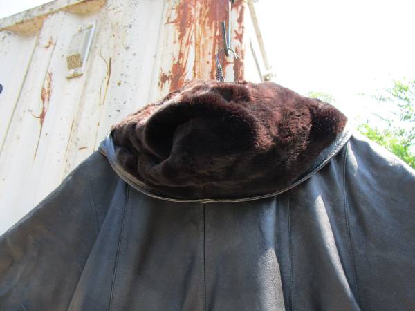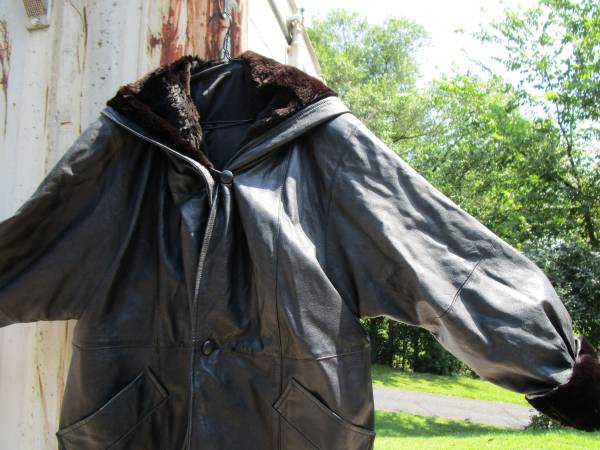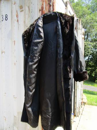 This is black leather trench style coat for sale. It has fur lined cuffs , hood and part of the inside lining. There is no name or size on this coat Believe it is custom made, not a guarantee. The length is from the top to the bottom 43" L. The sleeves are 22 1/2" L from under the arms and when cuffed 19" L. The width across from under the arms is 24" W. This coat dose show some sign of wear as our pictures show.There is 1 button missing as we did show. The coat does button up fine with out it as shown. You can text or call at 608-78one-one96one. If it posted it is for sale, thanks.