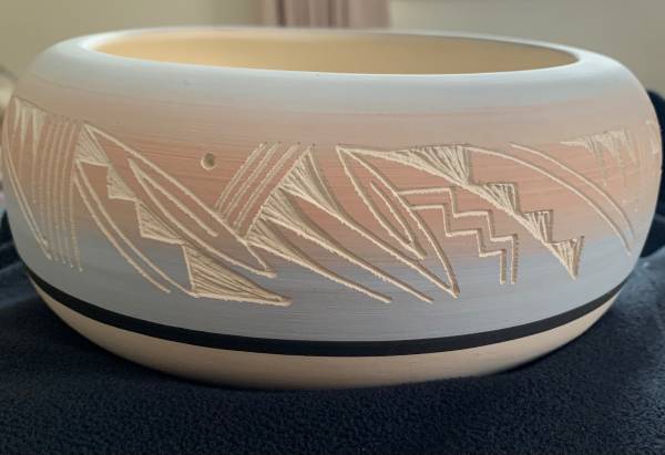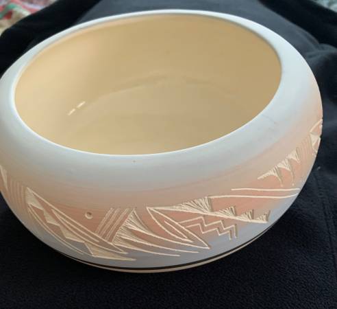 Round Ute pottery bowl (8.5 inches across and 4' tall) signed by Laner. Etching in peach and light blue bowl. In excellent condition.