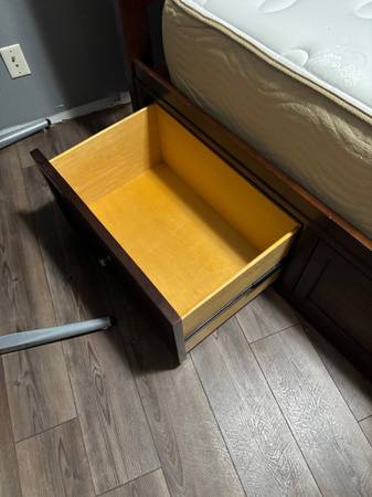 Twin bed frame in good condition. Has 6 large drawers underneath. Bought from Hom furniture several years ago. Nice mattress to go with it, no stains, always used mattress protector. I accept Cash...